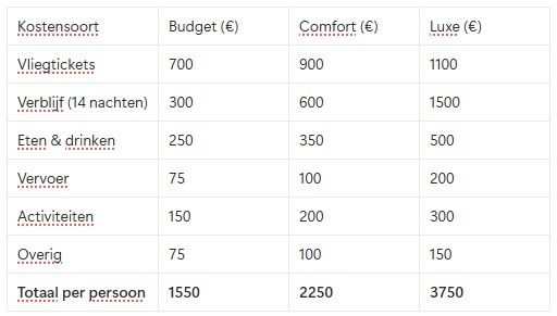 Let op: dit zijn gemiddelde richtprijzen voor individuele reizigers in 2025. Reizen met z’n tweeën of als gezin kan goedkoper uitvallen per persoon.